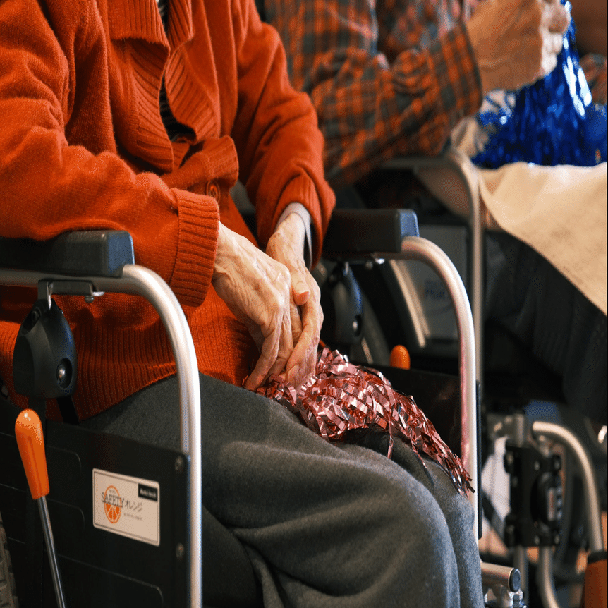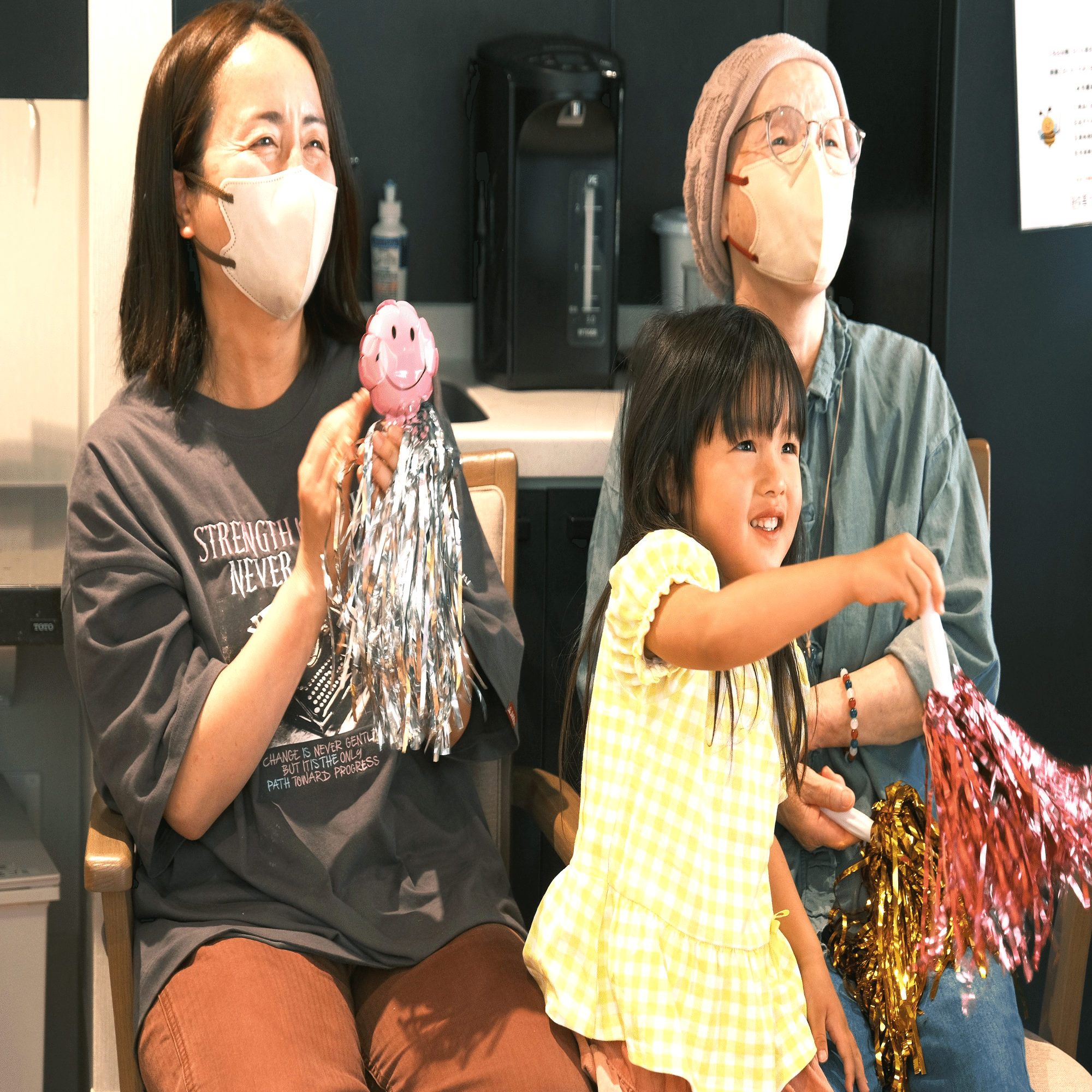 開演前、スタッフからご入居者様へ銀テープや鈴をお渡ししながら、「面白かったら、これをシャカシャカ鳴らしてくださいね〜!」とお声がけすると、皆さんがふふっと笑顔に。